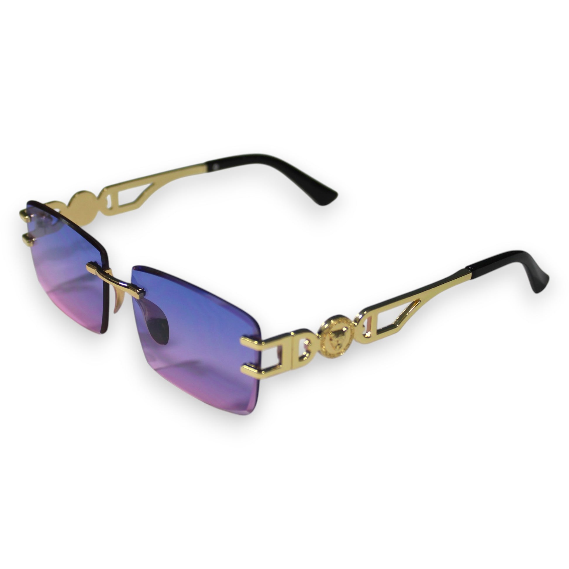 Sunglasses in Black, Beige/Brown, Purple, and Blue.